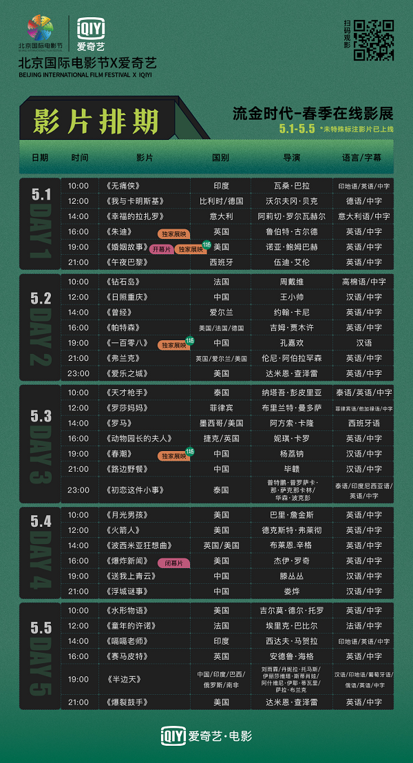 The highly anticipated offline Beijing Film Panorama of the BJIFF will return at the right time.We hope the Spring Online Screenings will provide more viewers with the convenience and enjoyment of watching the film by screening one newly released film available on a daily basis to accompany movie fans during the May Day holiday.For more information, stay tuned for the official Weibo accounts of the BJIFF and iQiyi Pictures. In the most beautiful season, we once again send an invitation to movie fans for the “commitment of meeting in spring”by presenting the most exciting films.