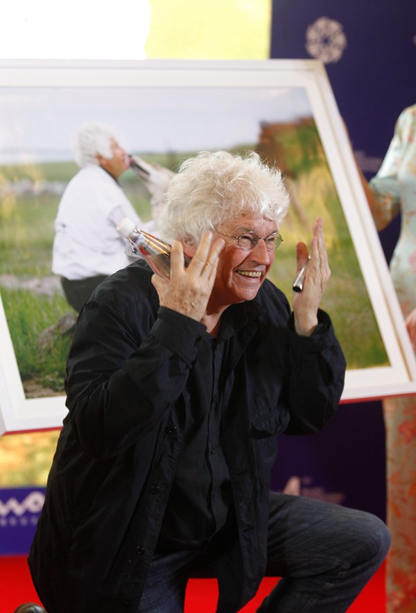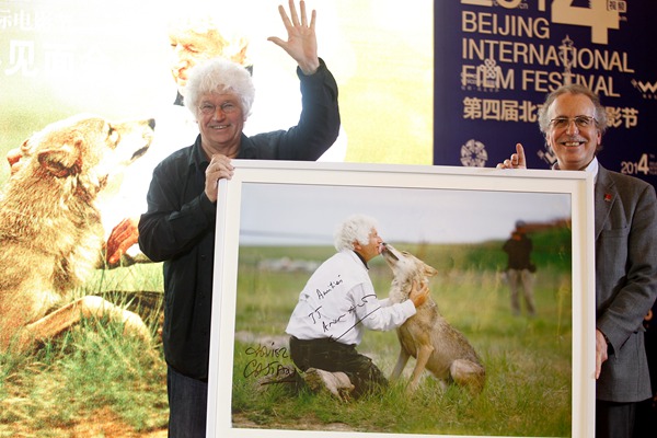The photo of Jean-Jacques Annaud kissing a wolf is placed in the spotlight at the Meet-the-cast-and-crew of Wolf Totem during the 4th BJIFF