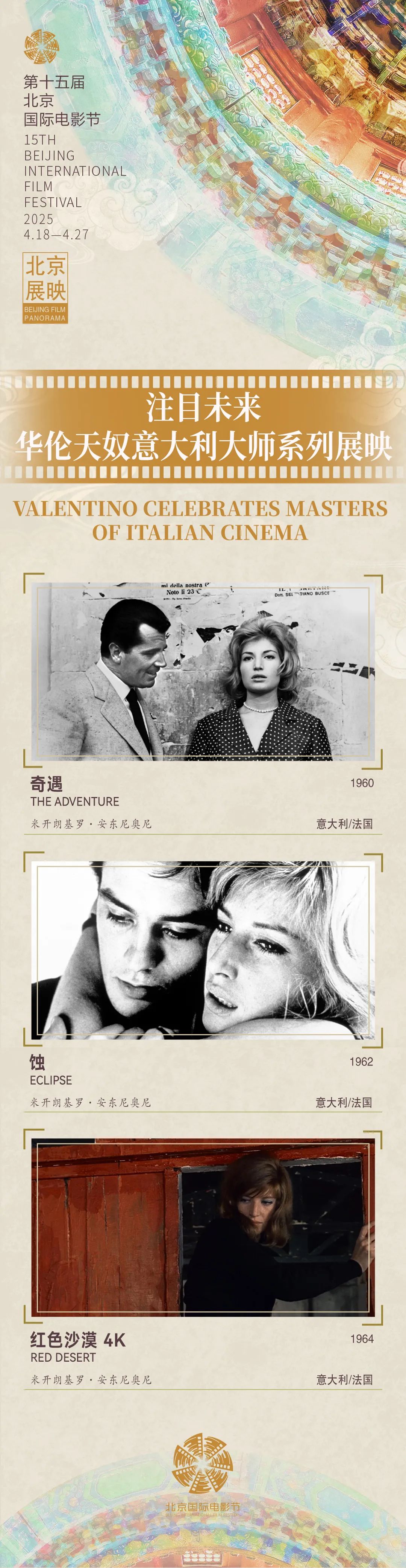 第十五届北京国际电影节期间,由北京电影学院主办的“注目未来”单元携手华伦天奴将特别呈现“意大利大师系列展映”,片单由华伦天奴创意总监Alessandro Michele精心策划,精选意大利电影大师米开朗基罗·安东尼奥尼的三部经典作品:《奇遇》(1960)、《蚀》(1962)和《红色沙漠》(1964),带领大家再次重读现代人精神困境的影像哲学文本。