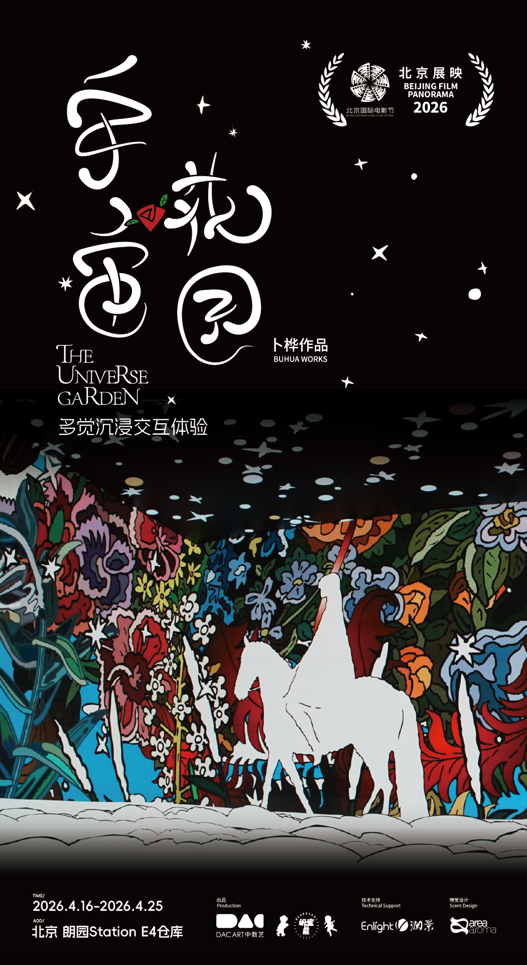 《宇宙花园》是艺术家卜桦关于人类能量觉醒的数字艺术沉浸多感知交互体验作品。宇宙,广袤无垠,象征着无尽的未知与可能;花园,繁花似锦,代表着生命的蓬勃与美好。二者交织于此处,成为人类内心世界的诗意隐喻。卜桦通过奇妙的色彩和繁茂的植物意象,创造了一个寓意精神世界灵魂世界的广袤宇宙,观众的靠近与行走能触发动植物的跟随与生长等多种交互效果,为观众带来一场“视”“听”“触”“嗅”多重感知的数字沉浸式体验。