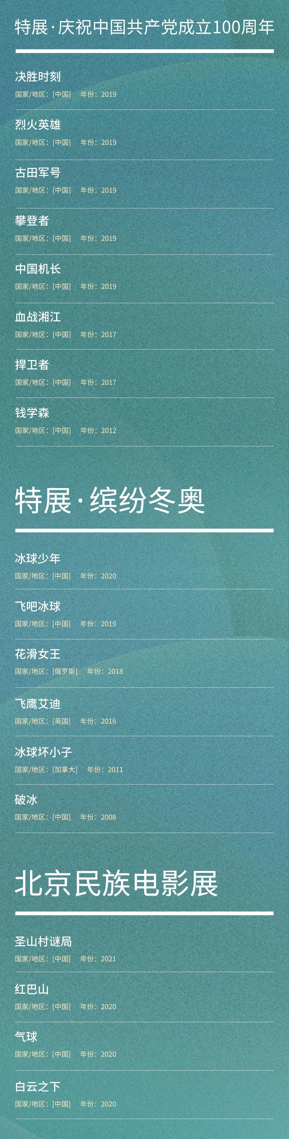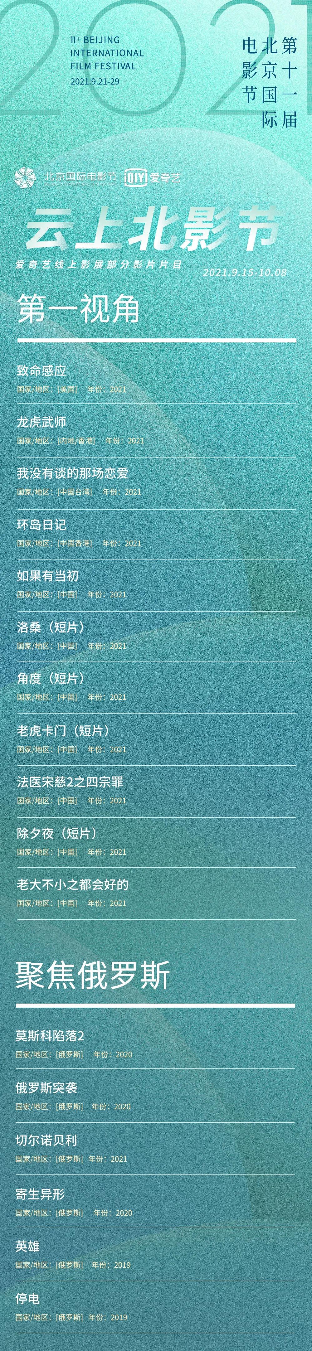 今日,爱奇艺云上北影节的今秋“plus版”豪华片单也正式释放,推出“第一视角”“聚焦俄罗斯”“震式发布”“迷影新声”“特展·庆祝中国共产党成立100周年”“特展·缤纷冬奥”“北京民族电影展”“好戏登场”“环球经典”“网络新浪潮”10大主题单元片单,囊括国内外近百部优质影片。