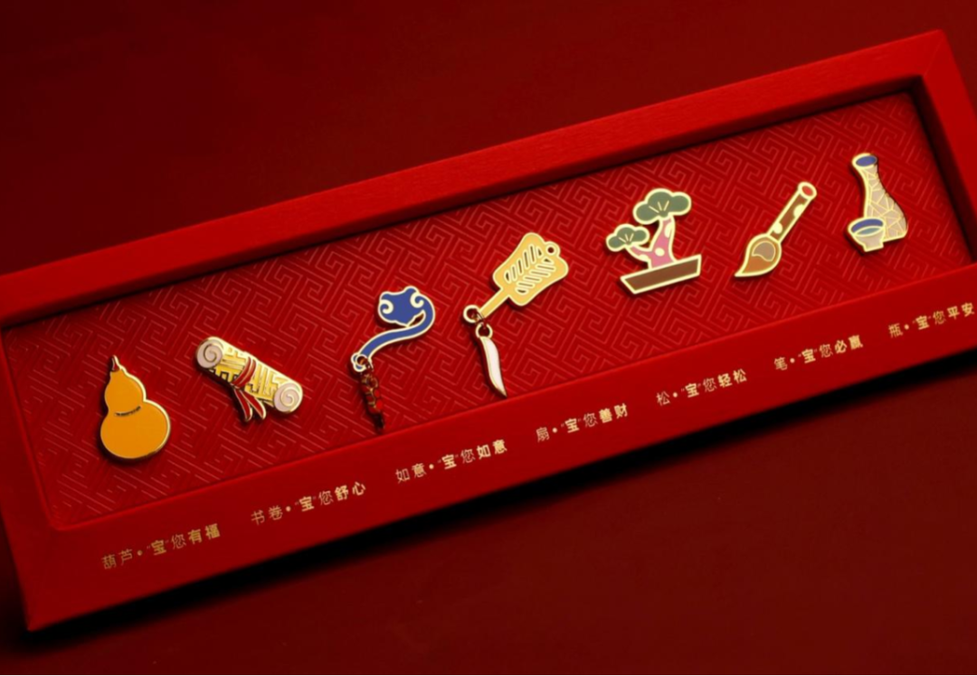 清供雅玩·奇宝随身·万象呈祥——荣宝斋《百宝箱》文玩徽章:徽章礼盒选取了诸多美好寓意的元素汇聚在一套礼盒中,衬底为传统万福纹,寓意福气绵长。