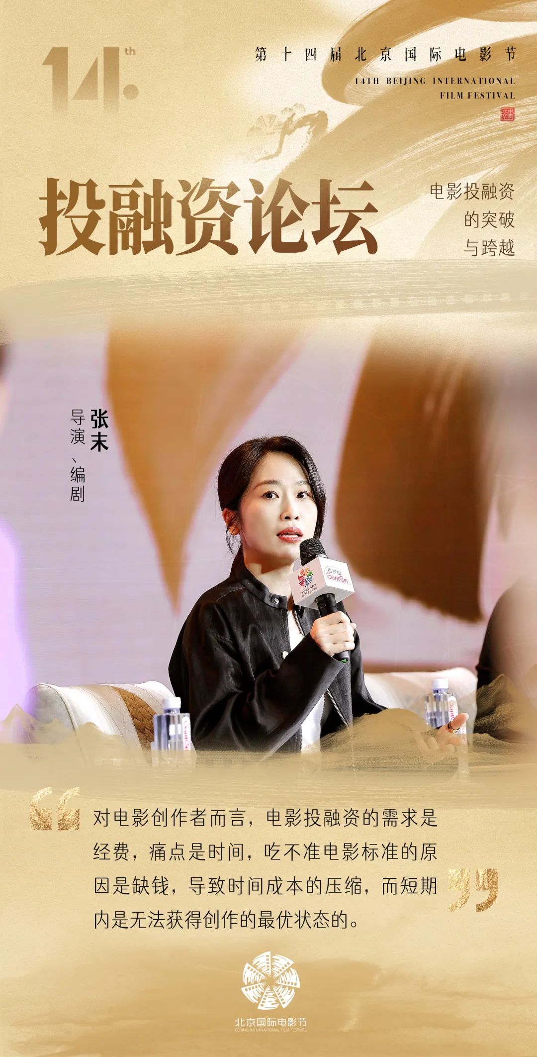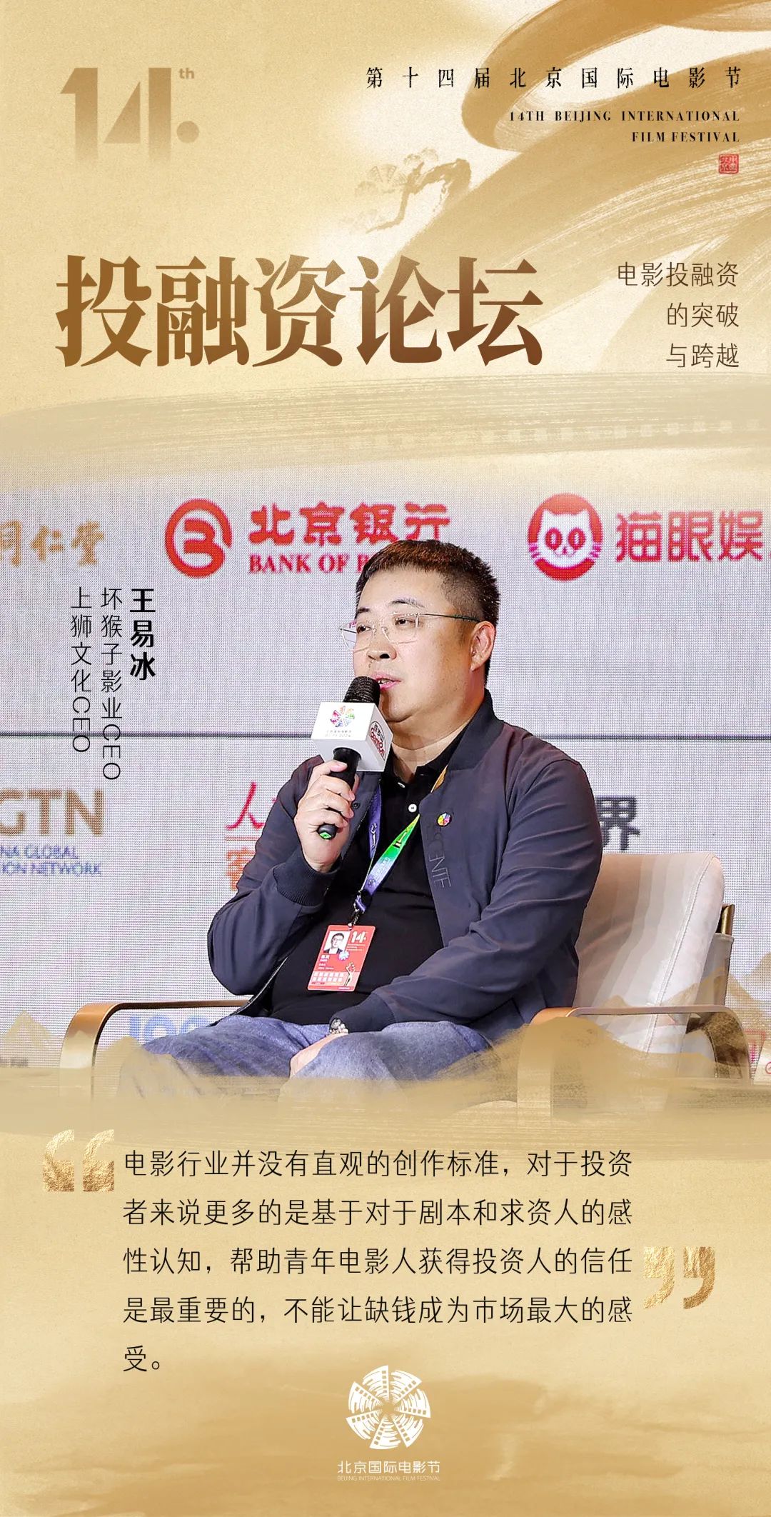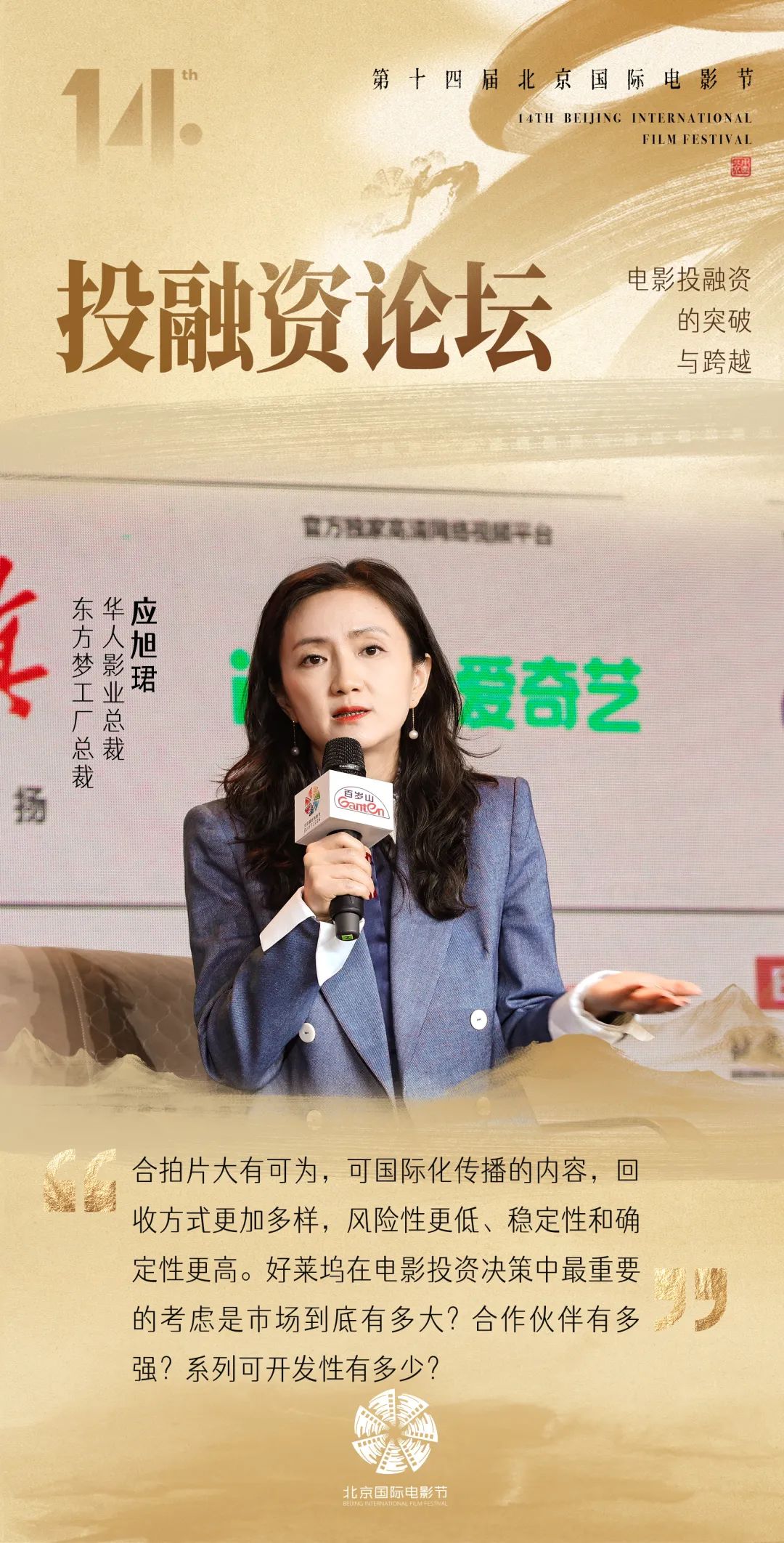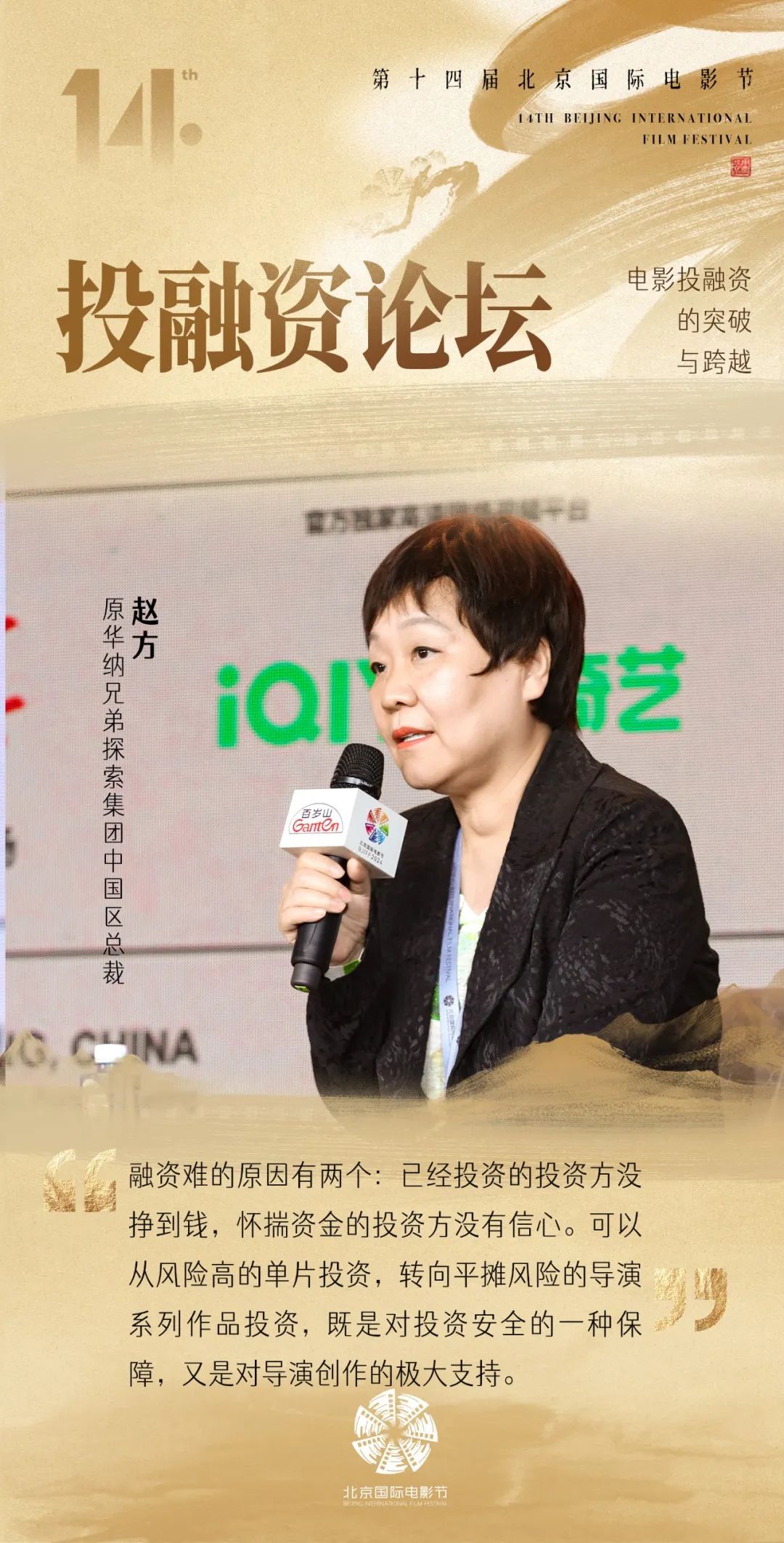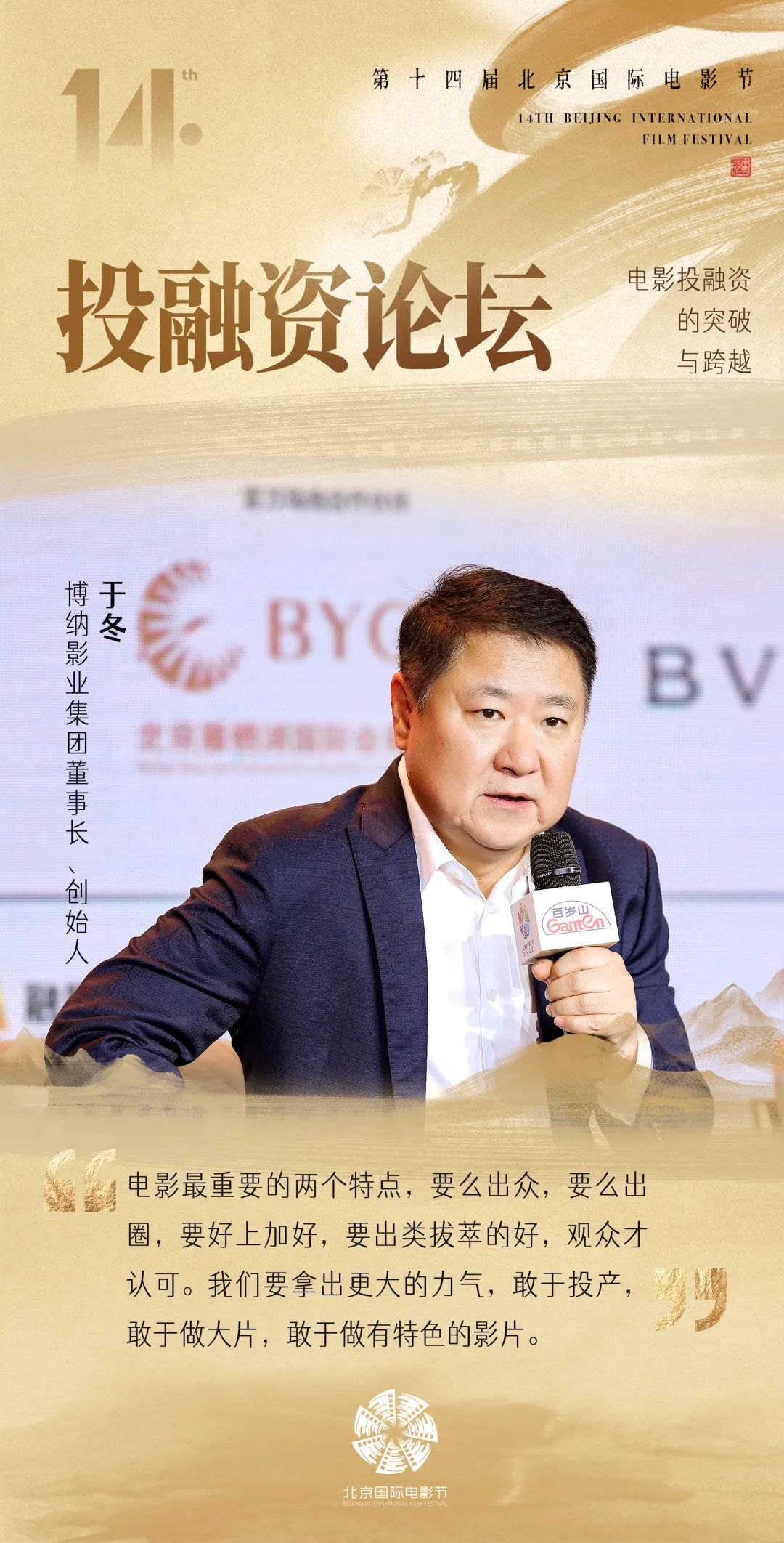 论坛现场,博纳影业集团董事长、创始人于冬提出:“我们要拿出更大的力气,敢于投产,敢干做大片,敢于做有特色的影片。”针对融资问题,原华纳兄弟探索集团中国区总裁赵方则认为:“可以从风险高的单片投资,转向平摊风险的导演系列作品投资,既是对投资安全的一种保障,又是对导演创作的极大支持。”