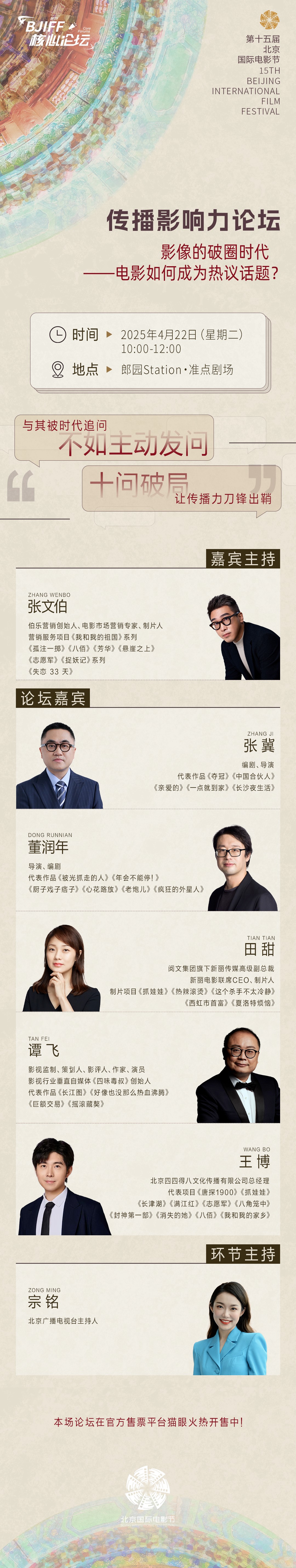 第十五届北京国际电影节传播影响力论坛将于4月22日上午10:00在郎园Station·准点剧场举办。论坛力邀六位电影产业与传播生态中的“破局者”同台,他们既是行业变革的见证者,更是创新实践的操盘手,将共同探讨全域传播生态下电影影响力的构建路径,探寻内容与流量、创作与宣传的最佳平衡点,为电影产业破局年轻市场、突破圈层壁垒提供新的思考方向。