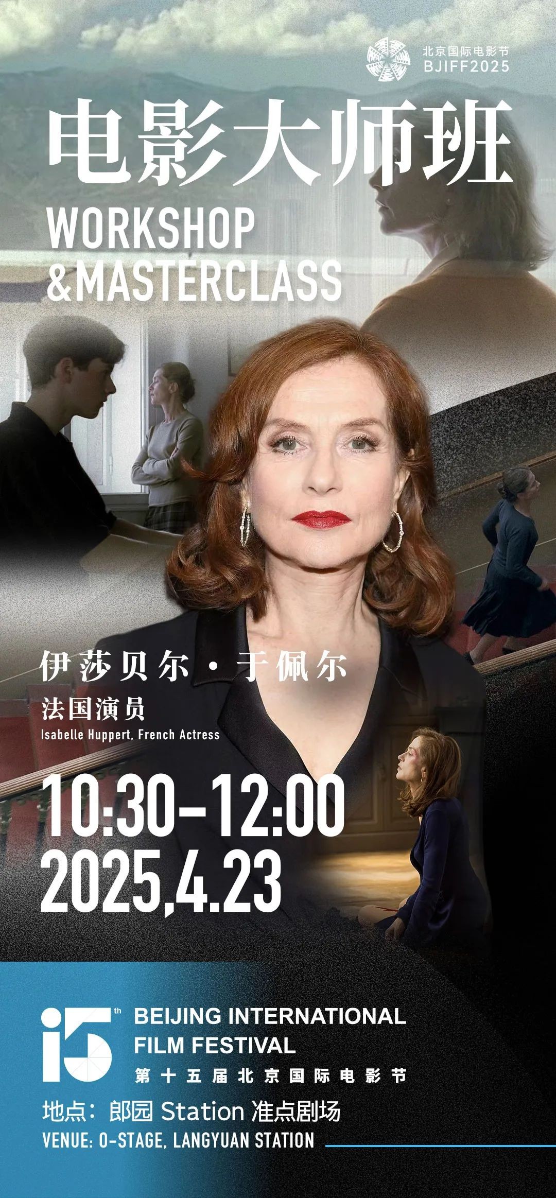 第十五届北京国际电影节电影大师班邀请到法国演员伊莎贝尔·于佩尔作为主讲嘉宾,她将与对谈嘉宾中国青年导演、编剧毕赣,主持人徐枫教授展开深度对话,以“冰纹下的暗涌:于佩尔的艺术风格探索”为主题,从于佩尔极具魅力的人物角色出发,漫谈表演,乃至整个电影艺术的过去、当下与未来。