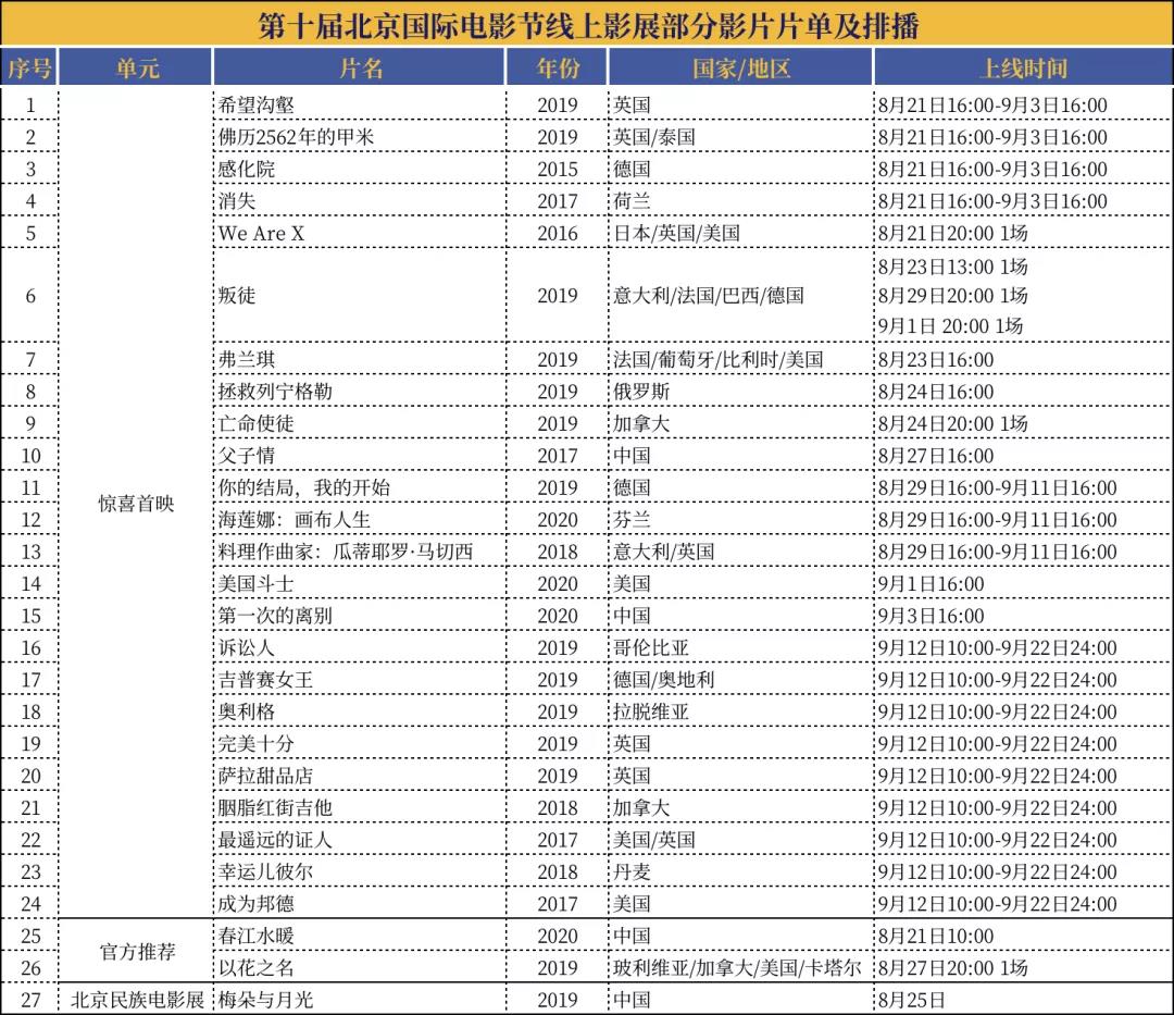 惊喜首映单元影片《We Are X》,将于8月21日20:00上线播放一场;影片《叛徒》,将于8月23日13:00、8月29日20:00、9月1日 20:00上线播放三场;影片《亡命使徒》,将于8月24日20:00上线播放一场。官方推荐单元《以花之名》,将于8月27日20:00上线播放一场。