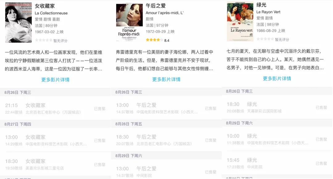 电影大师作品同样是北京展映一票难求的片子。今年,法国新浪潮大师侯麦,凭借强大的创作能力独自撑起了一个展映单元——“侯麦之约”,囊括了他多部经典作品,简直是侯麦迷的春天。六部影片《女收藏家》、《午后之爱》、《绿光》、《慕德家一夜》、《克莱尔的膝盖》、《双姝奇缘》全部售罄,足见火爆。