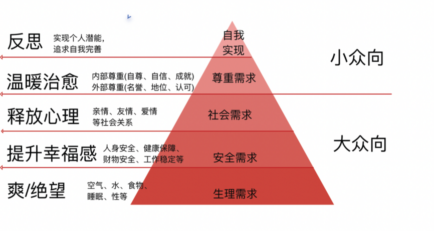 For films aiming for substantial box office success, the subject matter should be closely tied to the three fundamental needs: physiological, safety, and social needs (such as family and friendship). In contrast, films that delve into profound themes like human nature exploration and self-reflection correspond to higher-level needs - esteem and self-actualization - and tend to appeal to niche audiences.