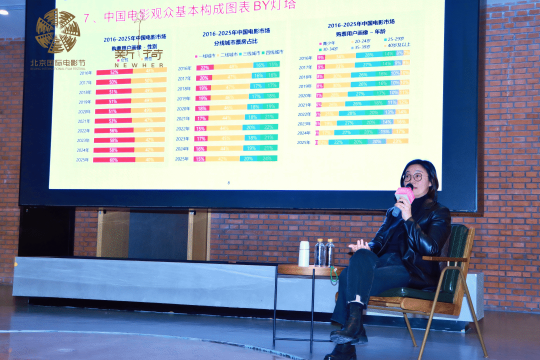 The seventh chart Jessica Chen presented was the Basic Demographic Composition Chart of Chinese Film Audiences. She emphasized, "A film is a content product. You must first be clear: who are you making this for? What is their gender, age group, and city tier?" This directly determines the film's target audience, the scale of its potential viewership, and its box office range.