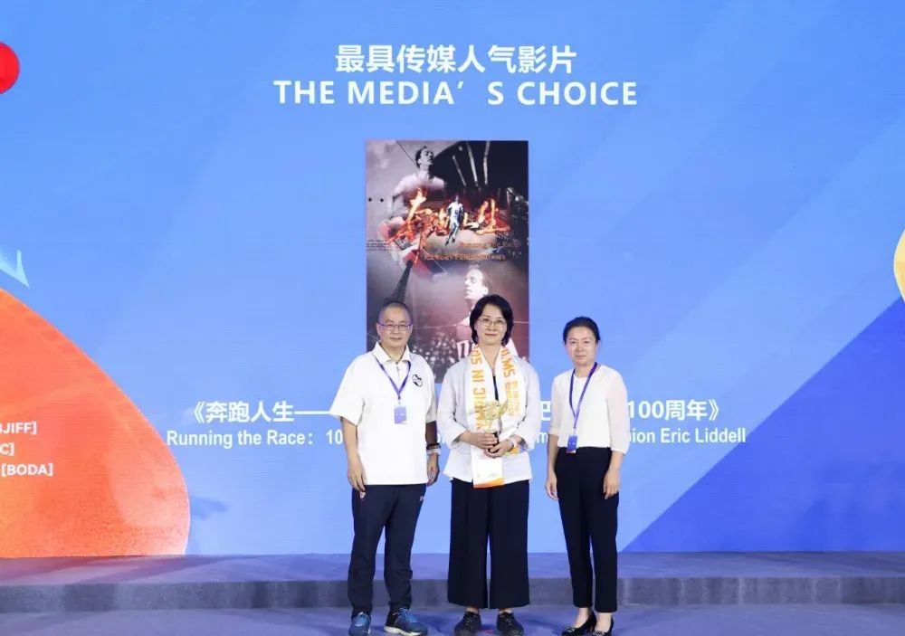 李华君和新华社高级记者、北京分社工会副主席汪涌为最具传媒人气影片《奔跑人生:纪念奥运冠军李爱锐巴黎夺冠100周年》颁发荣誉。