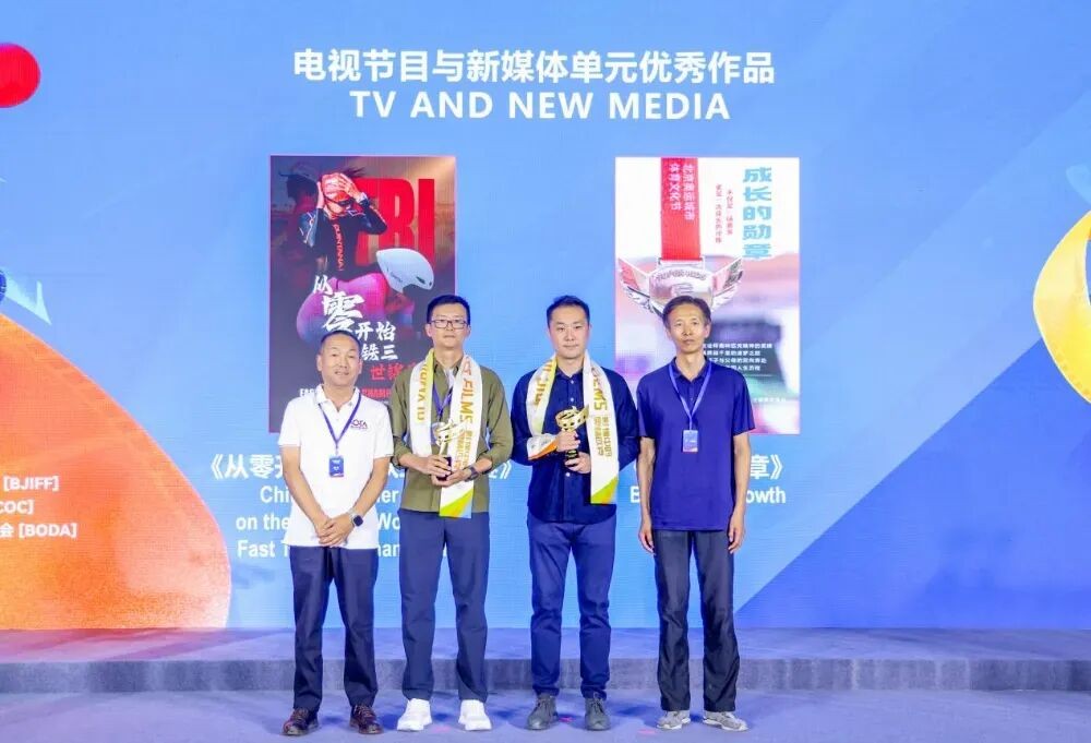 北京市广播电视局宣传管理处三级调研员毛宏伟、青岛电影学院影视艺术创制中心主任陈亮为电视节目与新媒体单元优秀作品《从零开始进入铁三世锦赛》《成长的勋章》颁发荣誉。