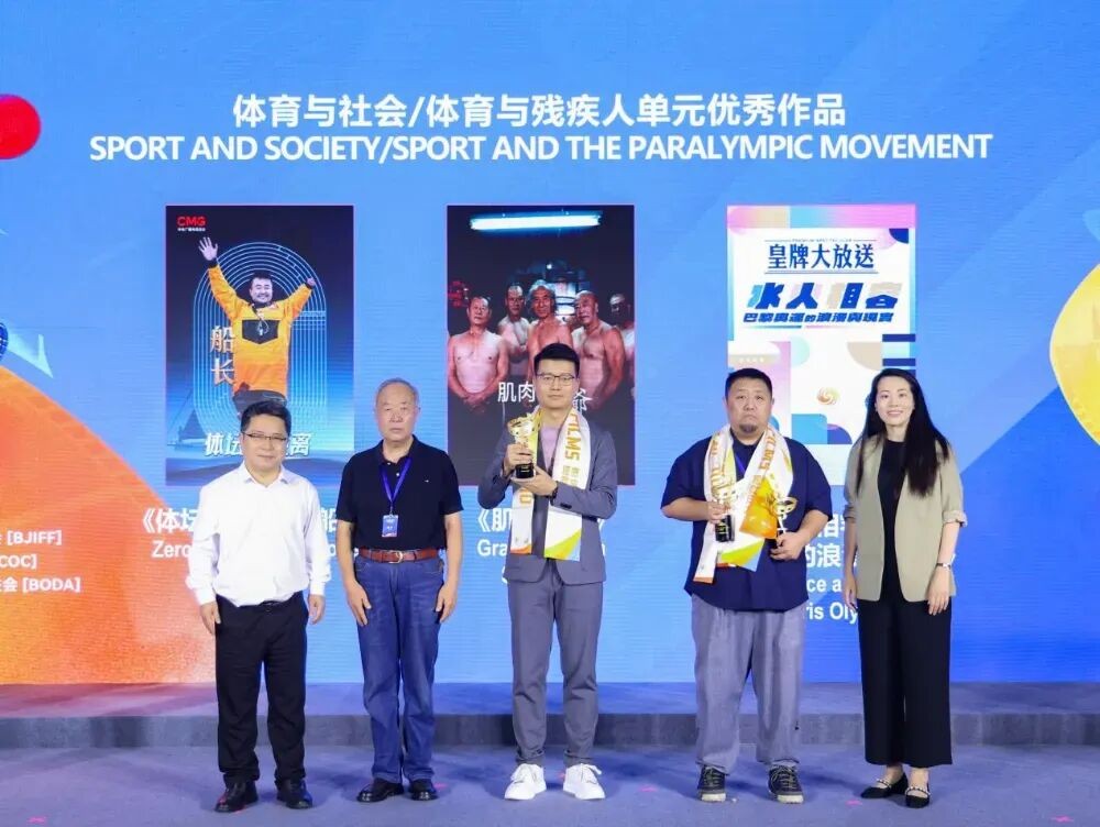 王响平和北京市国有资产经营有限责任公司文化体育产业部经理于楠、中国电影艺术研究中心研究员单万里为体育与社会/体育与残疾人单元优秀作品《体坛零距离—船长》《肌肉爷爷》《水火相容——巴黎奥运的浪漫与现实》颁发荣誉。