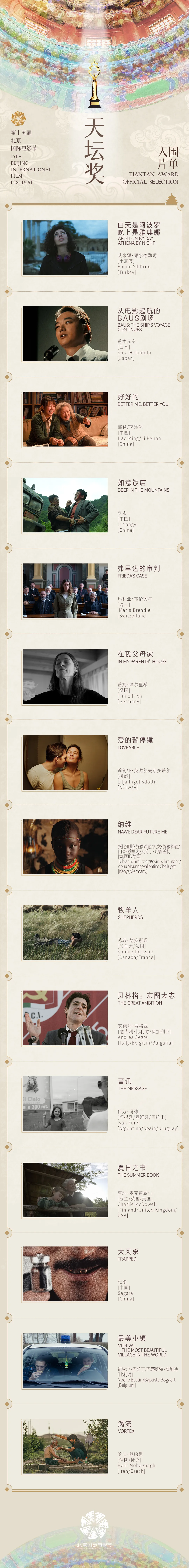 全球影坛精品力作齐聚北京,向全球影迷发出光影邀约。3月27日,第十五届北京国际电影节新闻发布会正式揭晓本届主竞赛单元“天坛奖”入围影片。