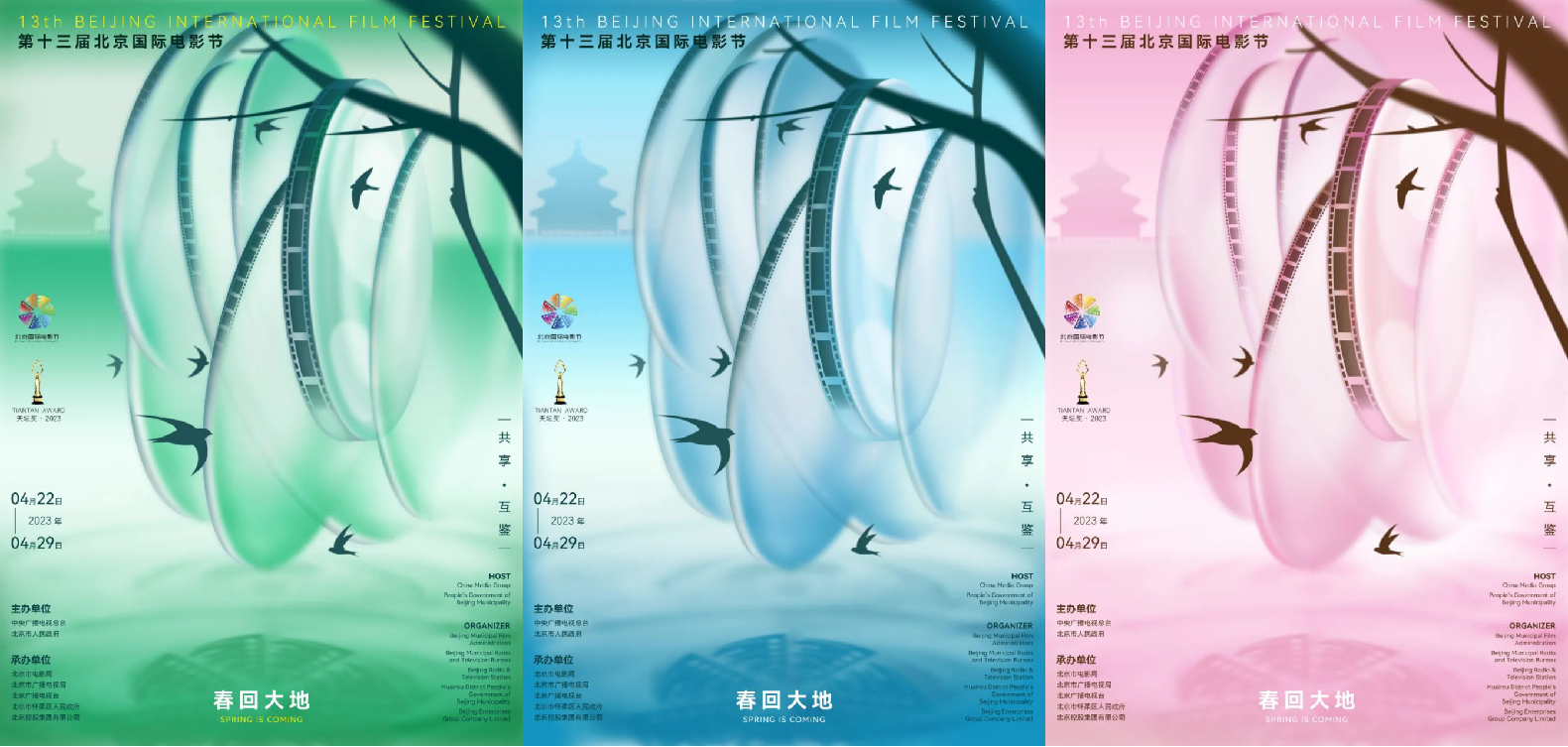本届北影节海报主题为“春回大地”。选取了三种北京春天最熟悉、也最沉醉的色彩,分别是象征着柳色青青、芳草依依的“嫩绿”;象征着雨过天晴、碧空如洗的“天青”;以及象征着桃之夭夭、灼灼其华的“淡粉”。系列海报既像是一幅描绘春天的画卷,也像是一首赞美春天的长诗,充满了中国文化的独特意蕴。