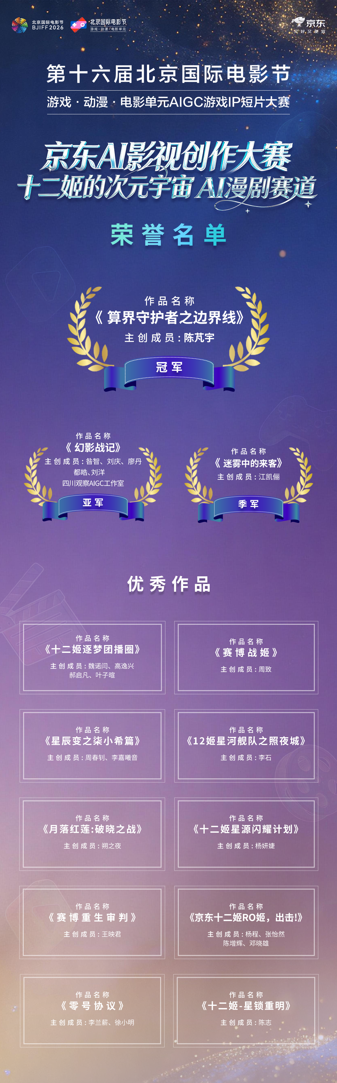 2026年,第十六届北京国际电影节游戏·动漫·电影单元AIGC游戏IP短片大赛圆满收官!本届赛事作为单元面向数字时代打造的标杆赛事,以“行业引领、产业联动、大众参与”为核心原则,携手京东、百度打造双赛道创作矩阵,致力于搭建前沿科技与艺术表达的展示平台,发掘优秀创意人才,借助AIGC技术突破影像创作边界,用AI重构影视动漫跨界融合新生态,深度探索AI与影视、游戏、动漫产业融合的无限可能性。