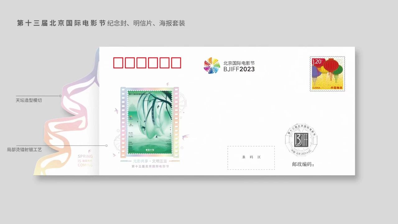 纪念封采用电影节主海报《春回大地》为素材,描绘出一幅京华春色、烟雨朦胧的诗意画卷。