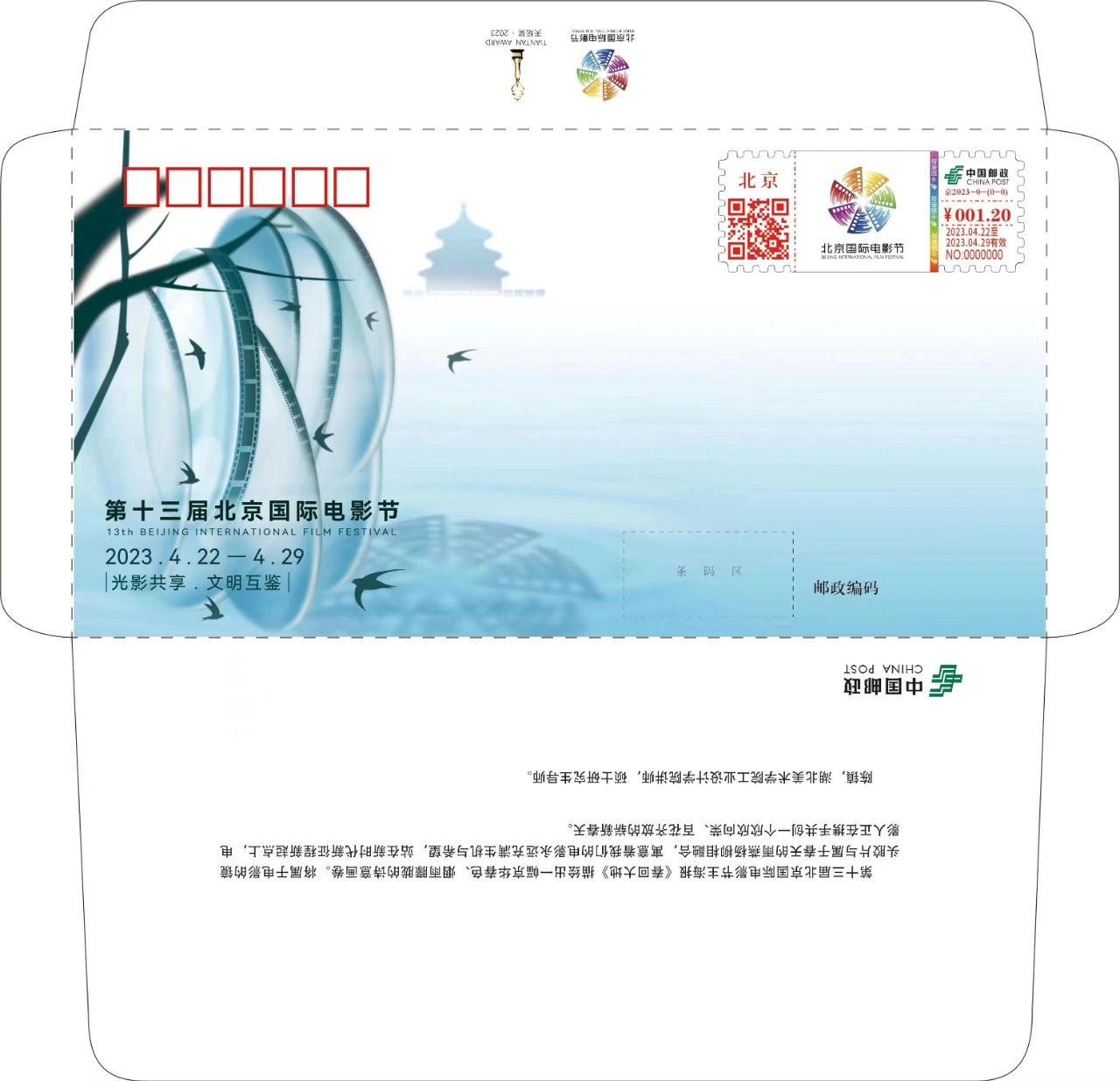 北京国际电影节彩色邮资机戳面值1.2元,使用期限自2023年4月22日至2023年4月29日。纪念封采用特种布纹纸制作,工艺精美,限量发行,颇具收藏意义,受到与会人员的欢迎。