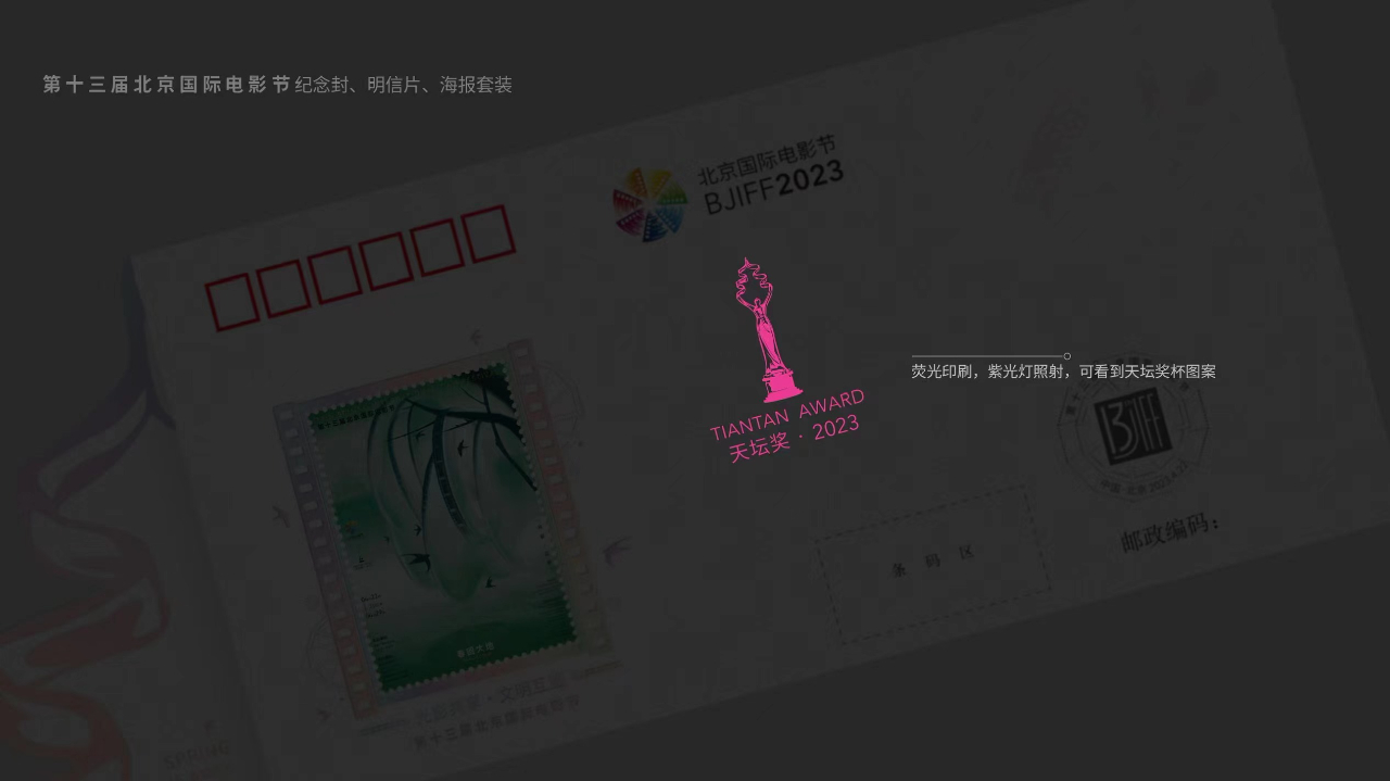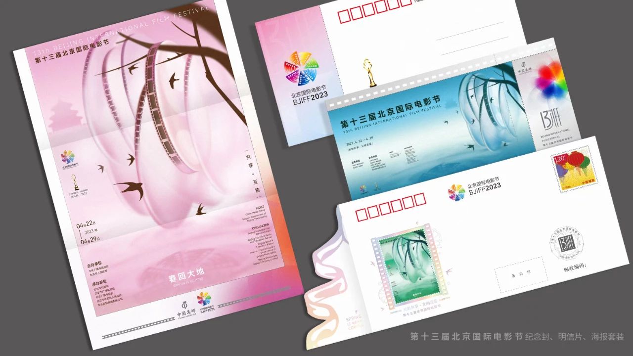纪念封套装以本届电影节宣传海报《春回大地》为主元素,将绿、蓝、粉三种色调的官方海报分别以纪念封、明信片、海报页三种形式展现,采用局部镭射工艺突出主题。