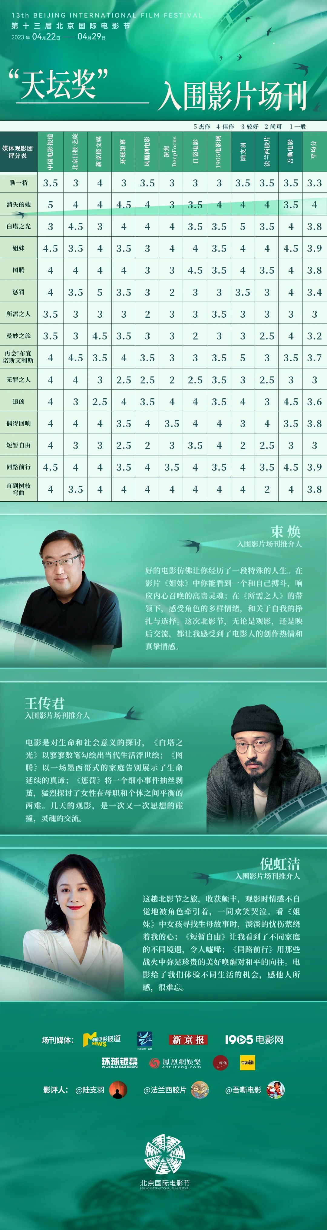 在本届场刊中,全新加入的束焕、王传君、倪虹洁三位“天坛奖”入围影片场刊推介人,分别从自身专业角度出发推介了最打动自己的精彩影片。此外,本届场刊还邀请到来自中国电影报道、北京日报·艺绽、新京报文娱、环球银幕、凤凰网电影、深焦DeepFocus、口袋电影、1905电影网,以及陆支羽、法兰西胶片、吾嘶电影共11家媒体的专业媒体人、影评人,以更专业的态度、更包容的心态、更严格的标准共同对“天坛奖”入围影片进行专业评分,旨在联合权威平台、集结专业力量,助力中外优质电影破圈发声,为中国电影及世界电影市场的多元发展注入“新动能”。