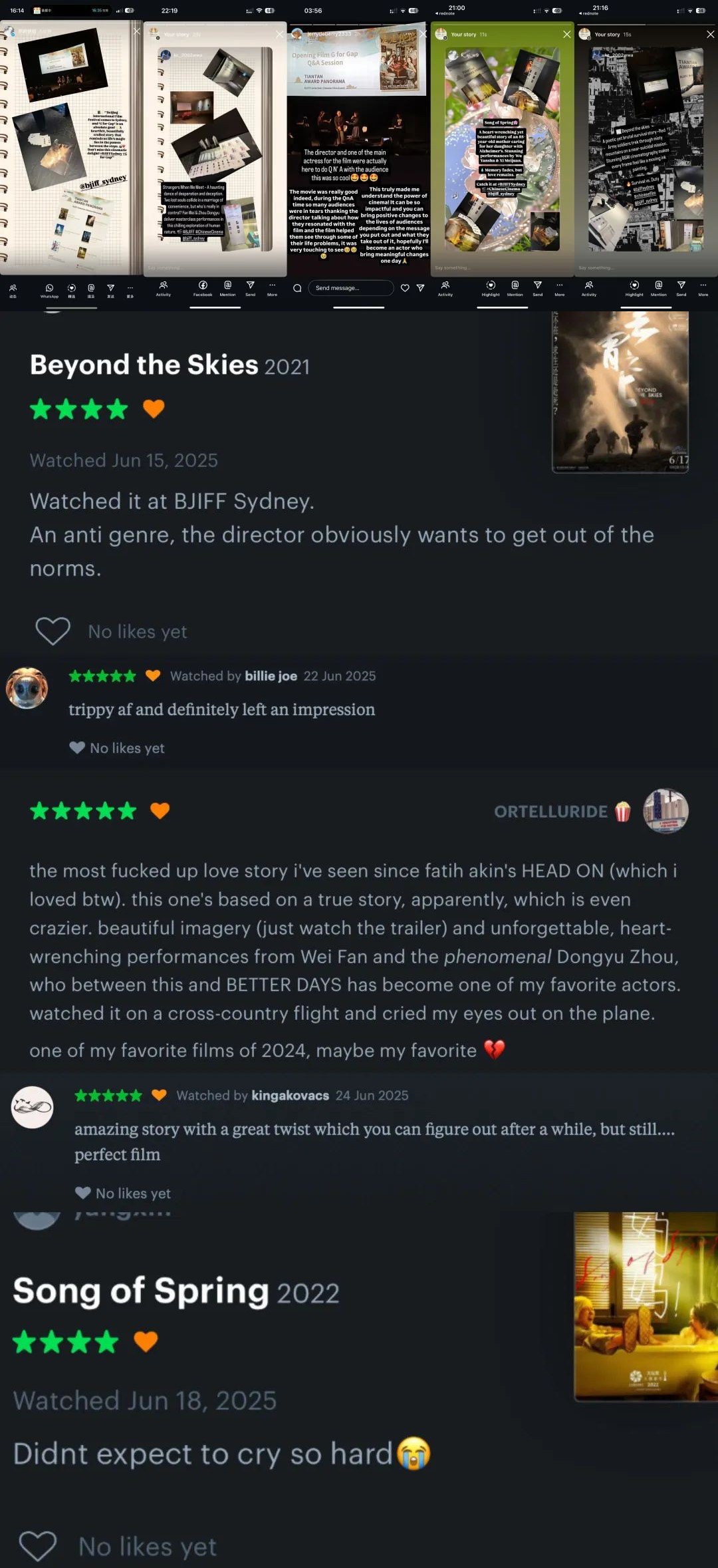 悉尼观众展现出对影片主题、影像风格的深入讨论与多角度解读。不少观众表示在《走走停停》中看到了自己:“这部片子回答了我当下人生阶段的所有困惑。”“有时候,我们只是需要一个小小的暂停,来记得我们从哪里来。”《白塔之光》引发了关于家庭关系的共鸣,网友评价道:“你不会变成你的父母,但你终究带着他们的影子。”《妈妈!》则让不少观众在跨越地域的时空中落泪:“没想到会在悉尼看到这部电影,而且哭得那么彻底”、“影片让我重新理解了时间与爱的关系”。《云霄之上》的黑白影像被称作“像流动的水墨”,其反类型的结构也引发不少影迷的兴趣。《消失的她》则被评价为“情节迷幻、记忆点强”、“尽管能猜到反转,但依然很有冲击力”。而《朝云暮雨》则带来了情绪上的强烈震荡:“我的心情像过山车一样。片中展现出的乡村景色也很具有视觉美感。”不少帖子还提到了对本次展映活动的感激,认为这是一场“超乎想象的惊喜”。