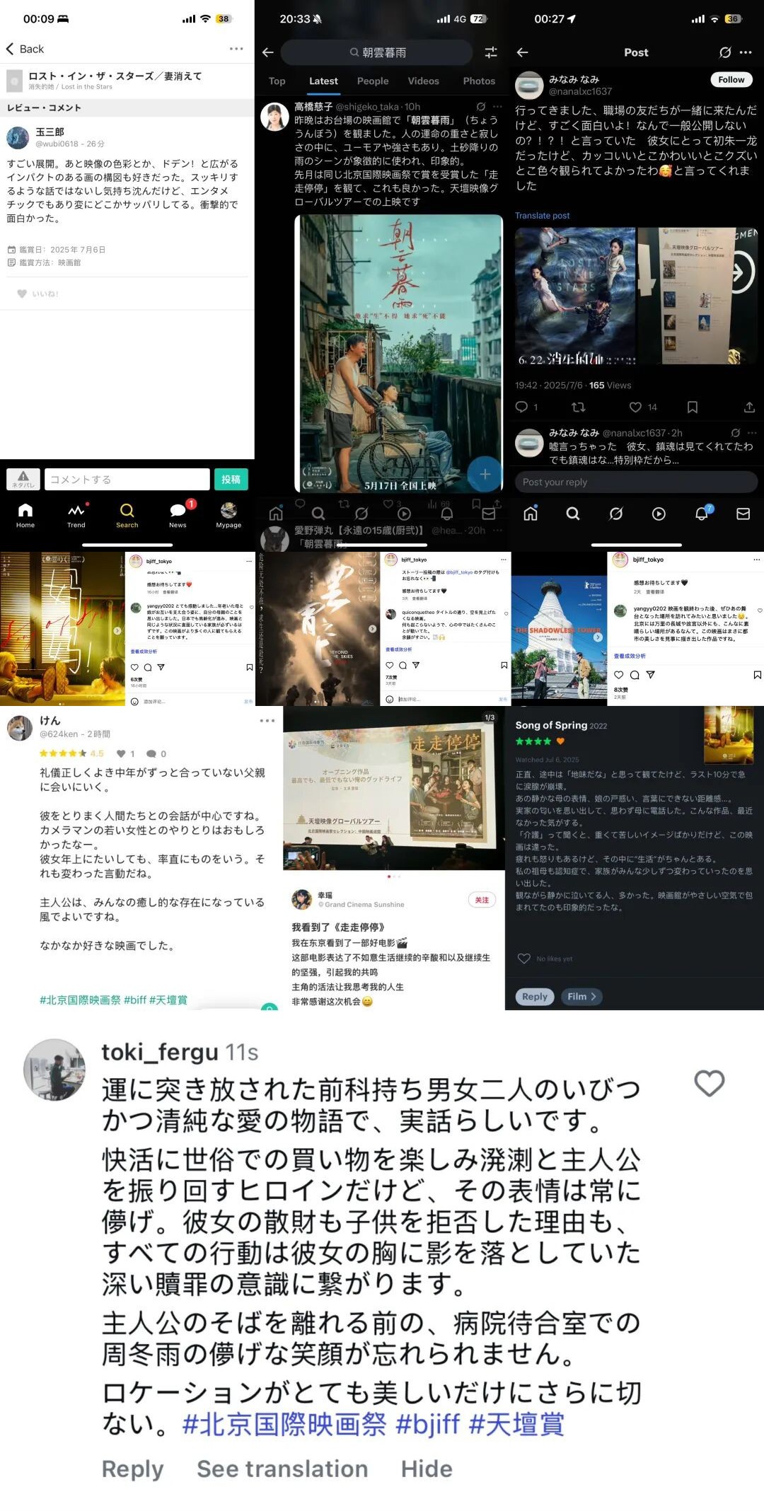 而东京站的观众则以更生活化、更情感化的视角走近影片,许多反馈源自个人经历与情感共鸣,质朴真挚。在《走走停停》的映后,一位观众说:“我在东京漂了十年,片中的那句‘混不下去就回来’,让我想起我妈对我说的原话。我看到胡歌躺在按摩椅上的那一刻,还有父亲的背影,我的眼泪就止不住了。”《云霄之上》则带领观众走进一场极致的战争废墟,有人觉得“影片如片名一样,让人有想要仰望天空的感觉,好像什么都没发生,但心里却早已翻涌不已”。《白塔之光》细腻地描绘了城市的另一种美感,有观众评价:“我想一定要去影片拍摄地看看。原来北京除了长城和故宫,还有这么好的地方。”《妈妈!》用无数微小的细节击中人心,有人说这是一部“温柔,但不逃避”的电影,也有人在观影后,默默地给母亲发了一条短信。不少观众称《消失的她》“以惊人的激烈展开”“很喜欢影像的色彩和具有冲击力的构图”“希望电影能在日本公映”。而《朝云暮雨》结尾的瓢泼大雨,令观众印象深刻,有人透过它看到了命运的重量。除此之外,还有不少日本观众表示,通过“天坛映像”的影片“能够很真实地感受到中国普通人的生活是个什么样子的,好像在和他们一起生活一样,这种体验非常棒”。