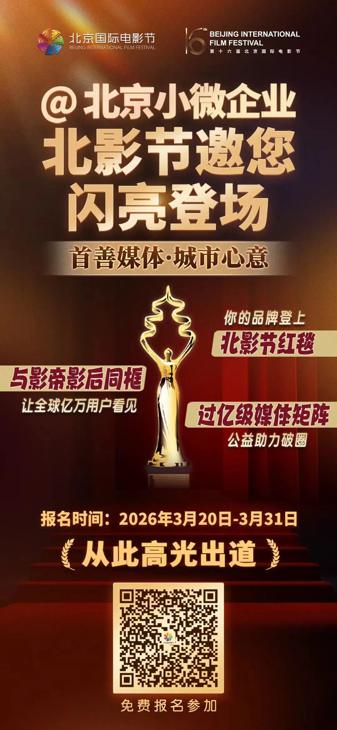 只要你是北京本地合规经营的影视小微企业,就有机会让你的品牌或作品登上第十六届北京国际电影节红毯,拿下价值超百万的品牌曝光资源包。