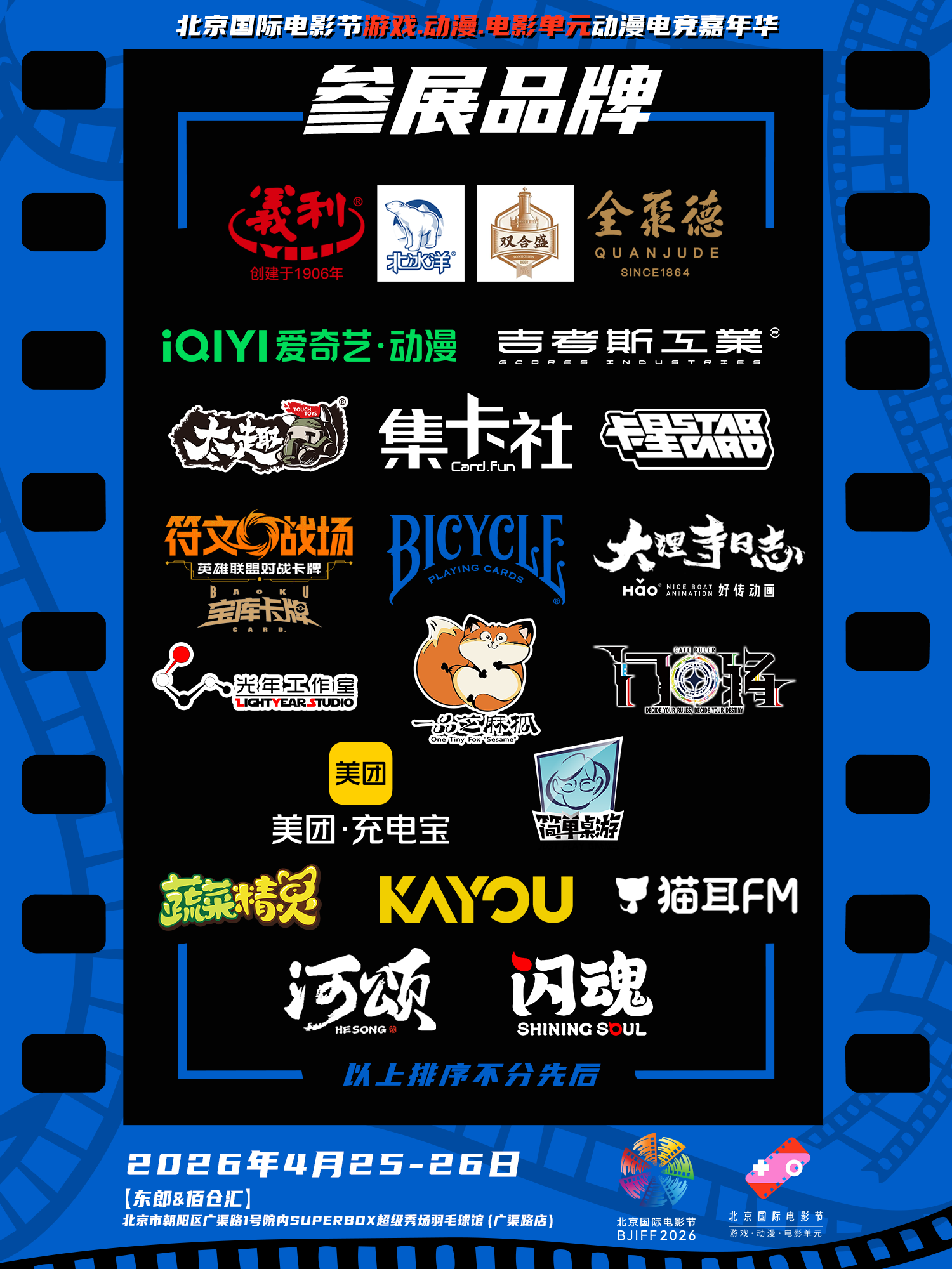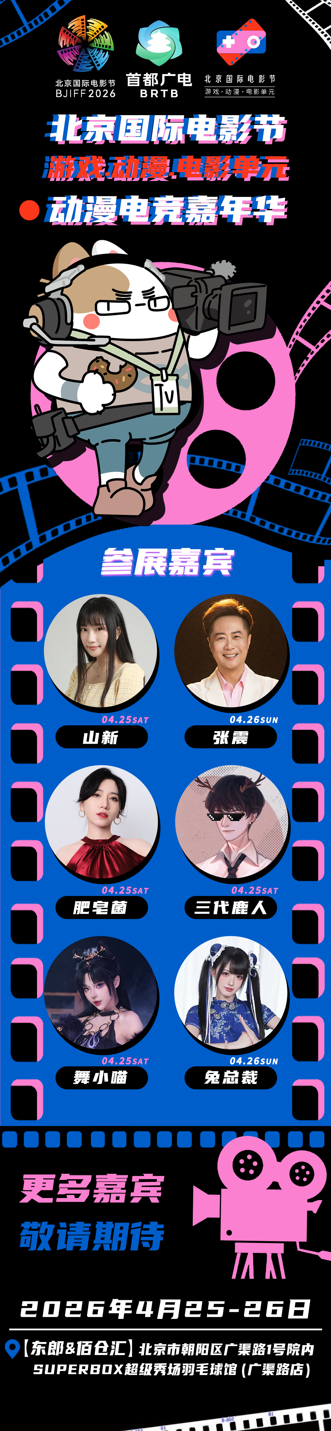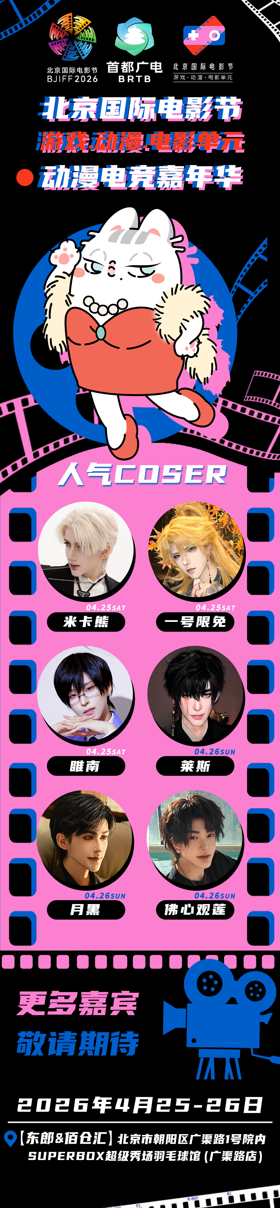 以电影为桥,以动漫为媒,以电竞为韵,一场打破次元壁的狂欢盛宴,即将在2026年春天拉开帷幕!4月25日-26日,由北京国际电影节组委会办公室、北京市广电局、北京电影协会、北京市电子竞技产业发展协会指导,北京春江暖文化传播有限公司主办的游戏·动漫·电影单元动漫电竞嘉年华在朝阳区【东郎&佰仓汇】SUPERBOX超级秀场羽毛球馆(广渠路店)盛大启幕。国漫IP、主创声优、B站博主、人气COSER、偶像团体,两天一夜,次元狂欢!
