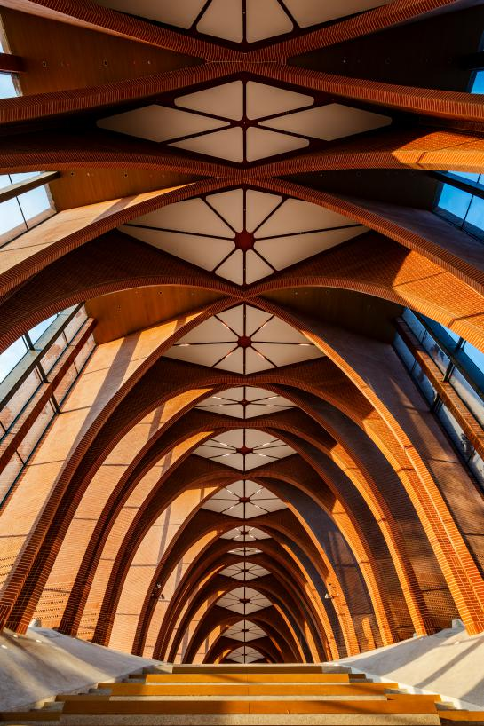 在中国科学院大学科学与艺术大楼,极简的线条勾勒出庄重。连廊的屋顶上,拉丁十字与中心十字相互咬合,交替螺旋上升,如同生命体的演变与发展。阳光灿烂的午后,漫步于光影斑驳的走廊,“年华似水”的比喻在此刻变得具体。